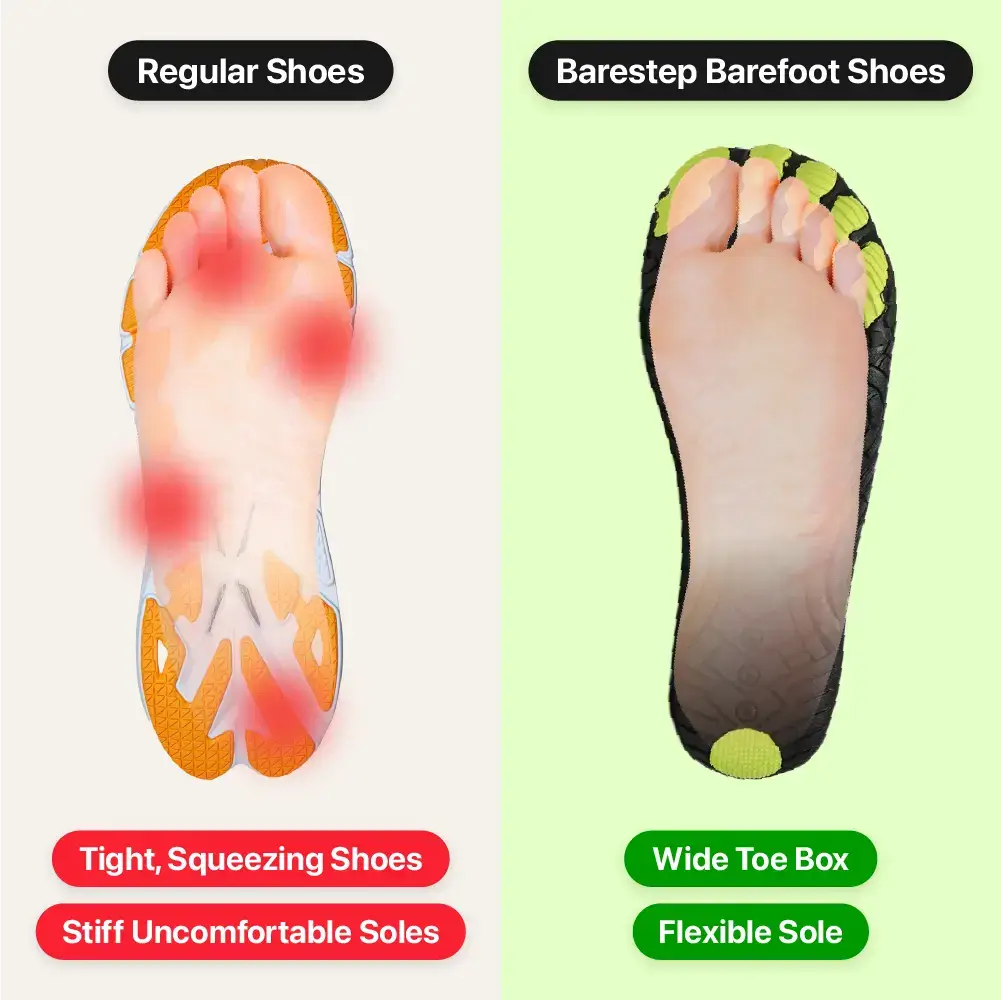 Are your feet hurting? Regular shoes are too stiff and cause pain in your feet, legs, and back. Barestep shoes fix this problem fast. Their thin, flexible soles let your feet move naturally.