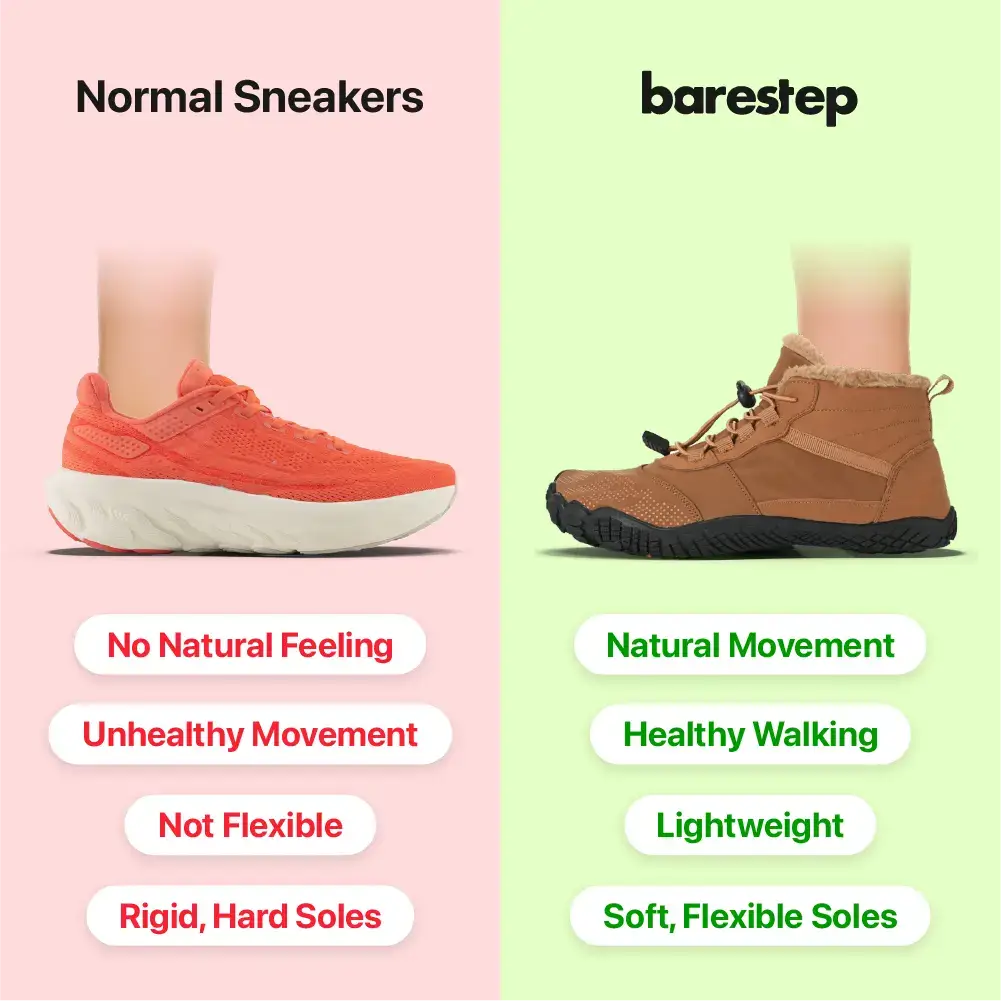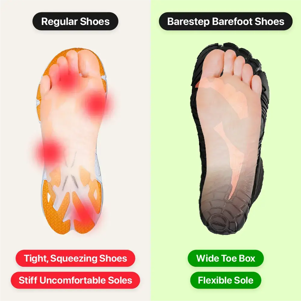 Are your feet hurting? Regular shoes are too stiff and cause pain in your feet, legs, and back. Barestep shoes fix this problem fast. Their thin, flexible soles let your feet move naturally.